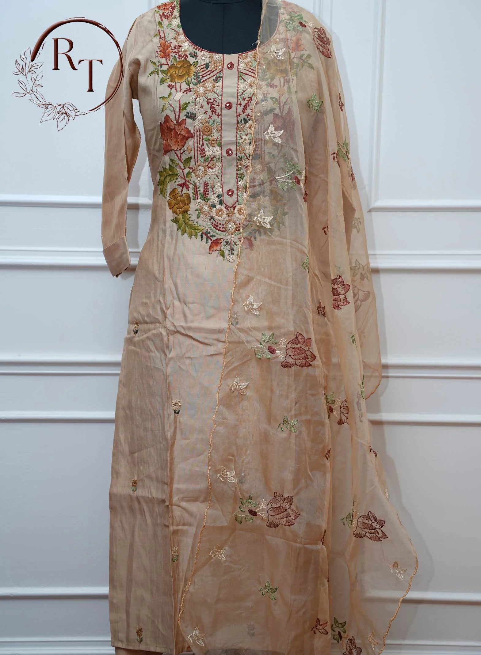 Beige Floral Embroidered Straight Cut 3 Piece Set