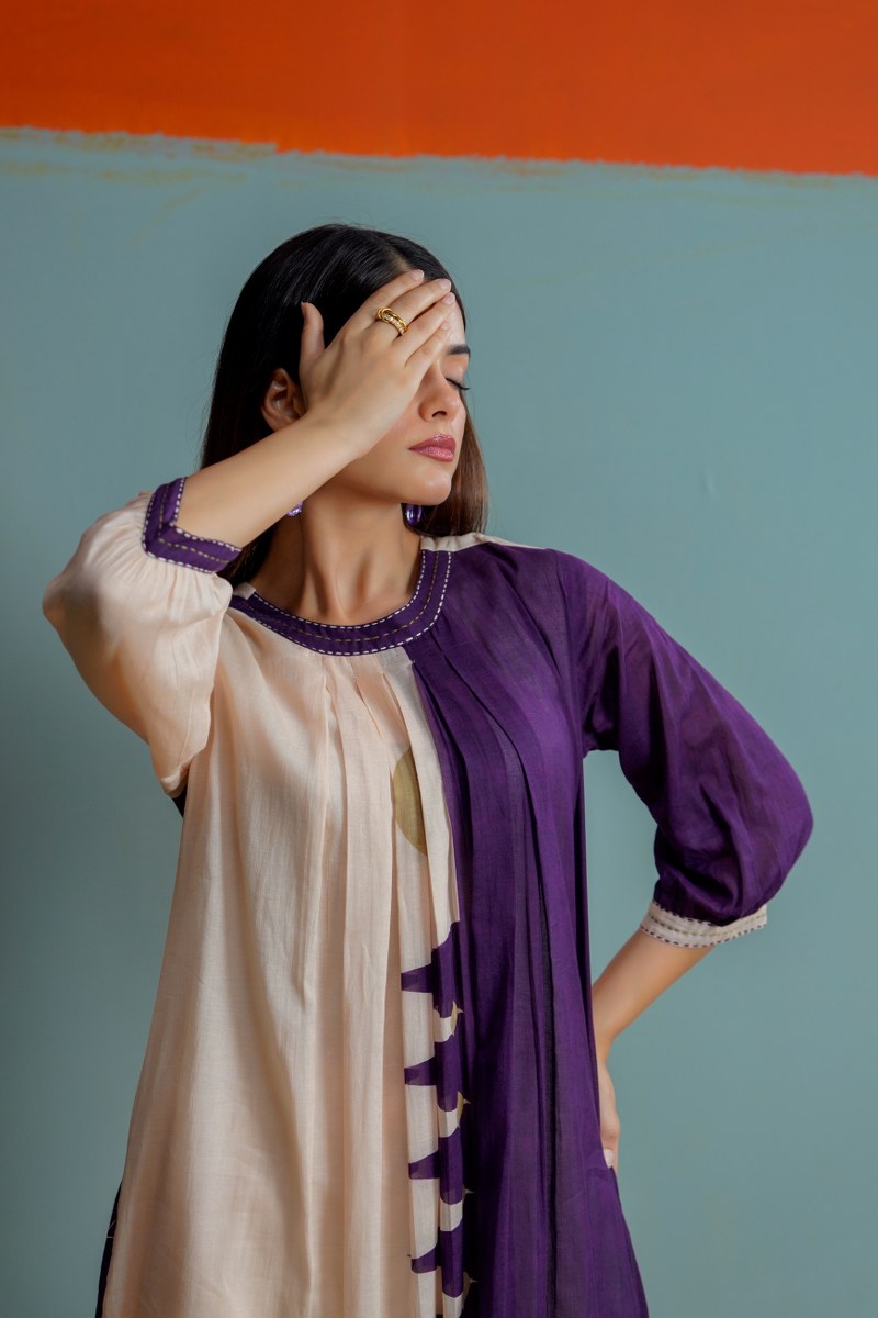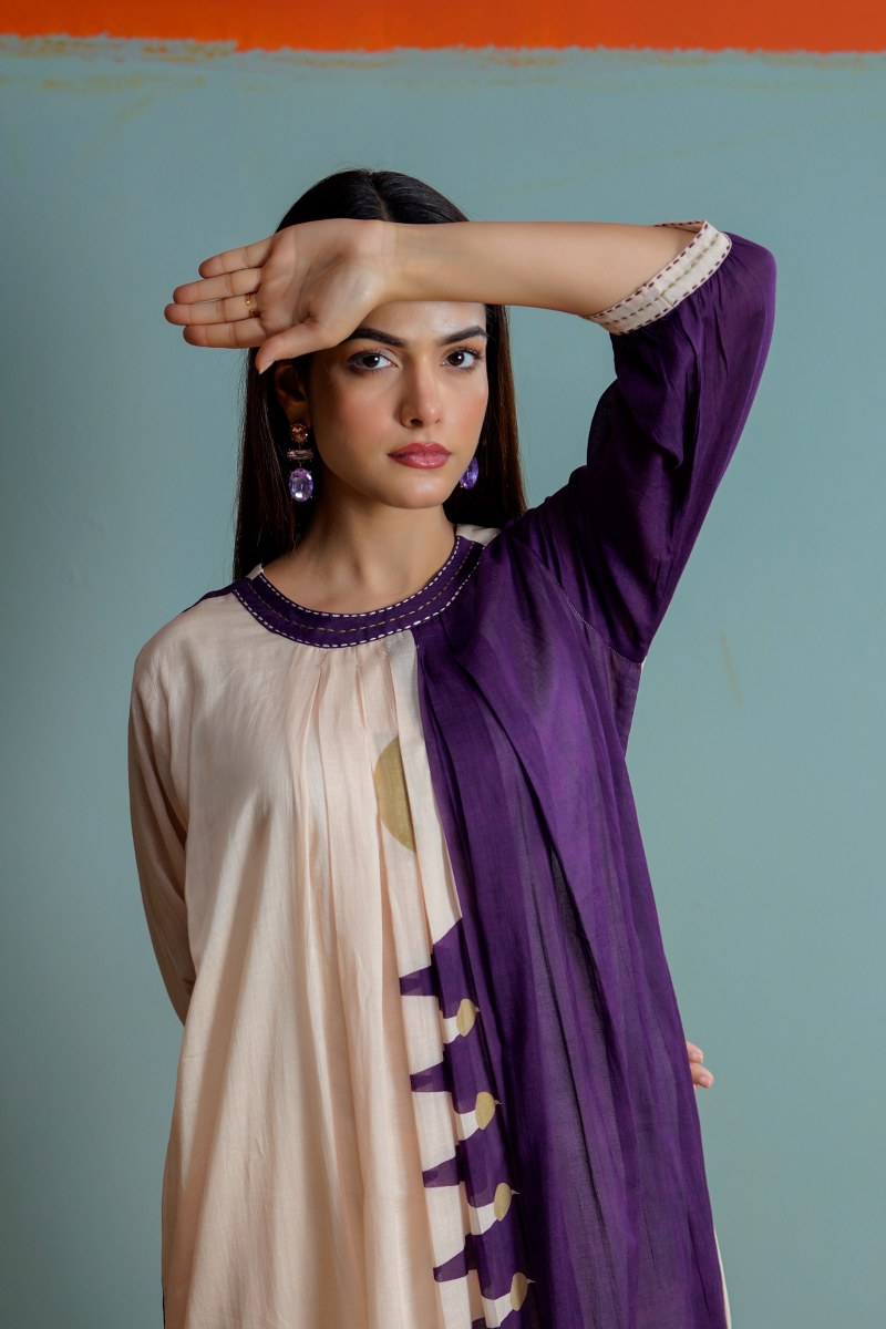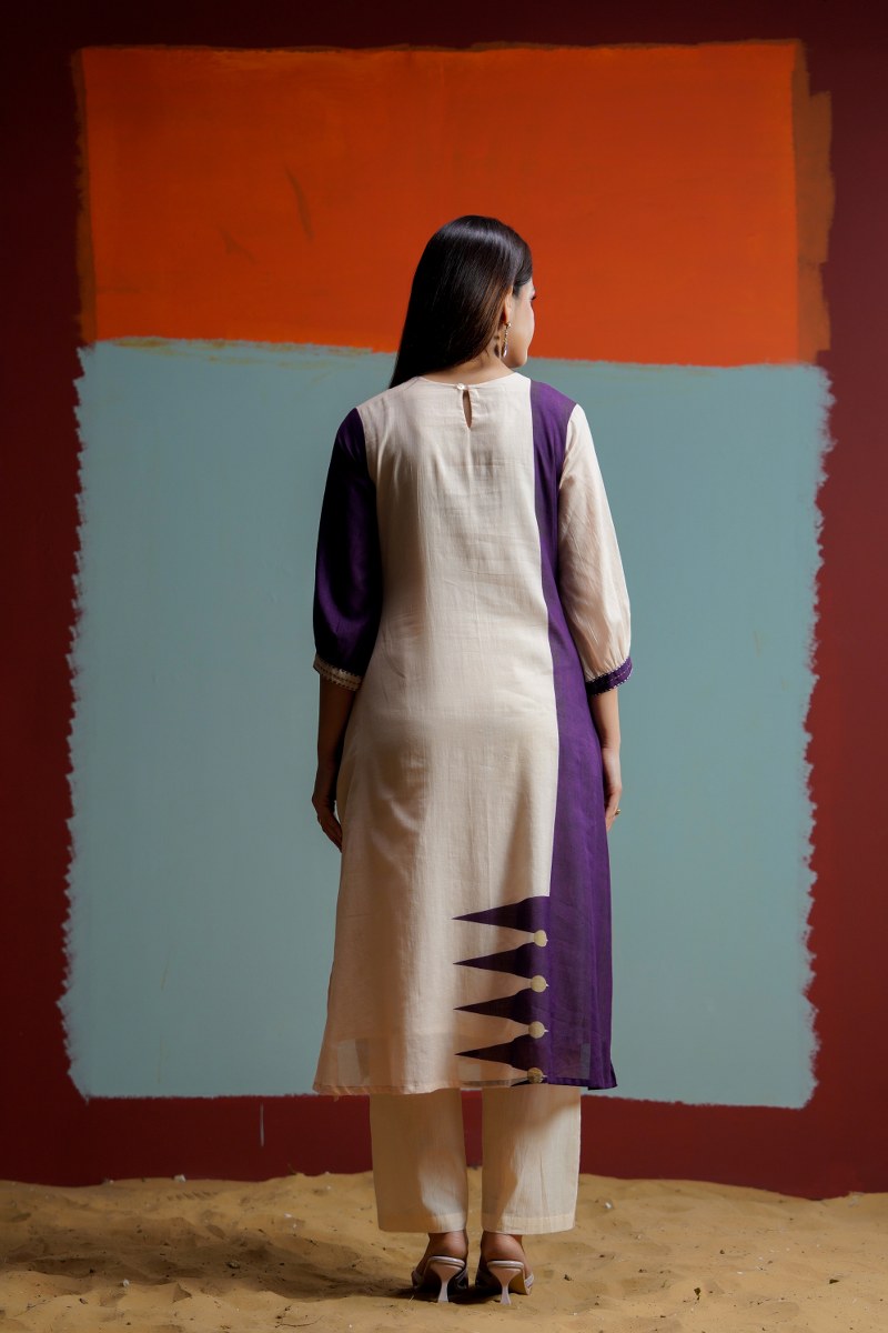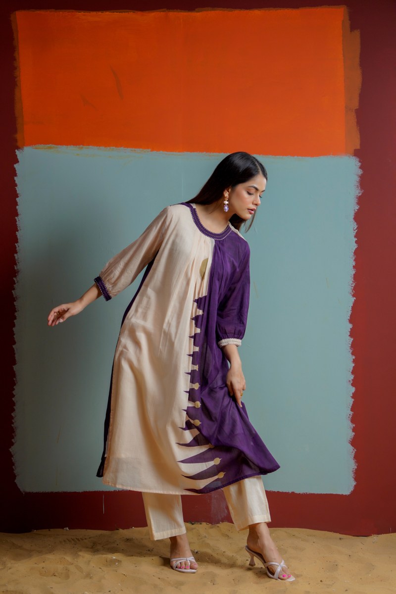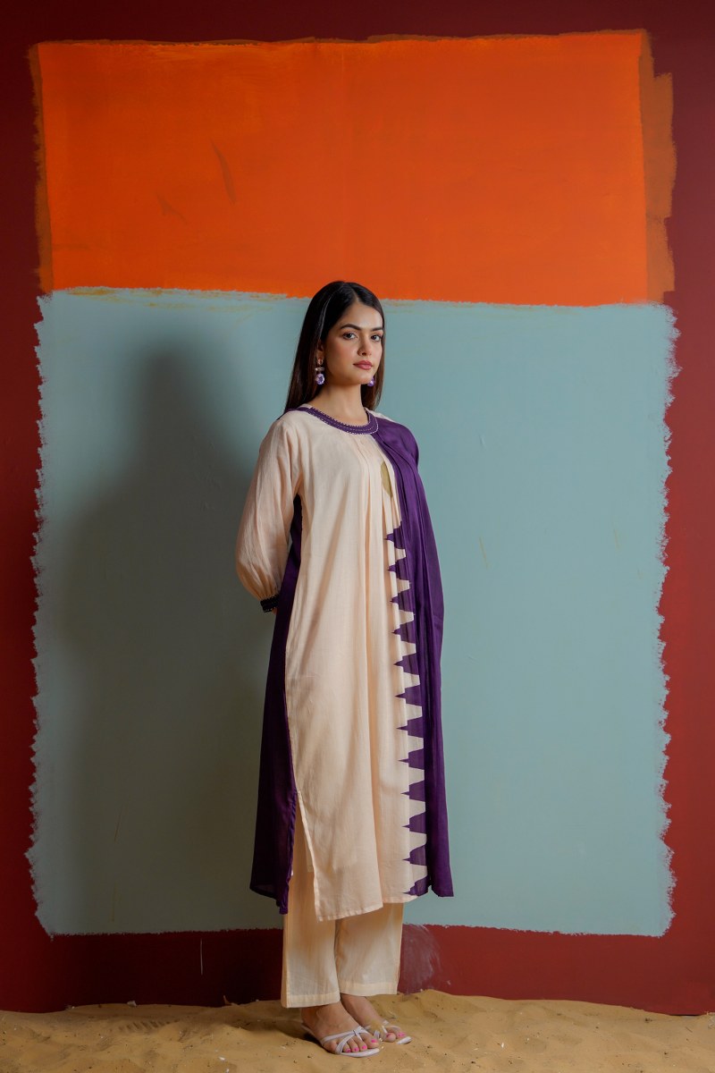 Beige & Purple Color Block Cotton Kurta 2pc Set 165
