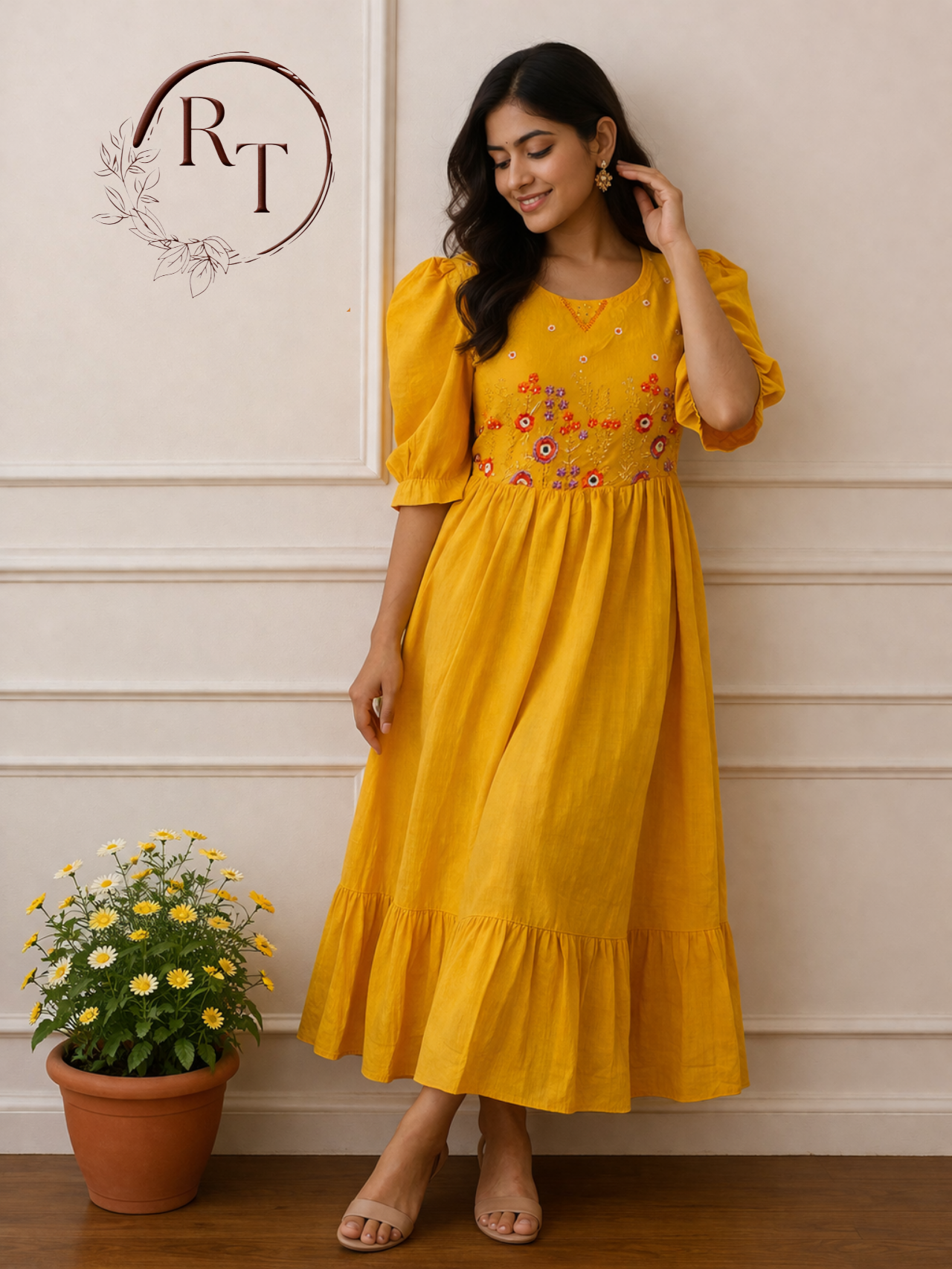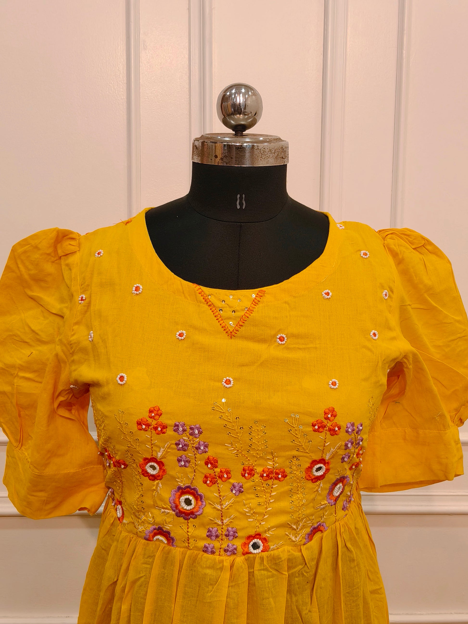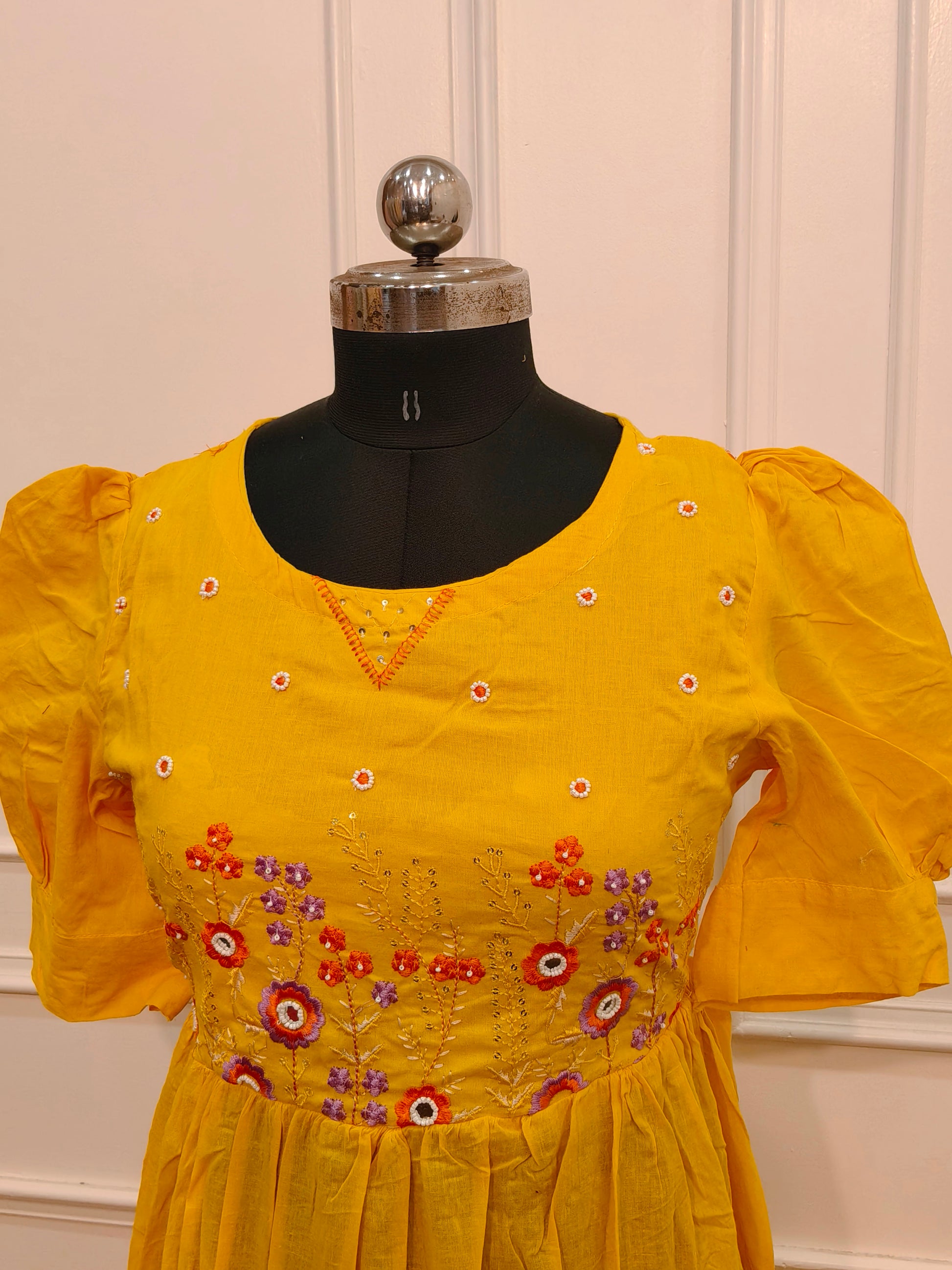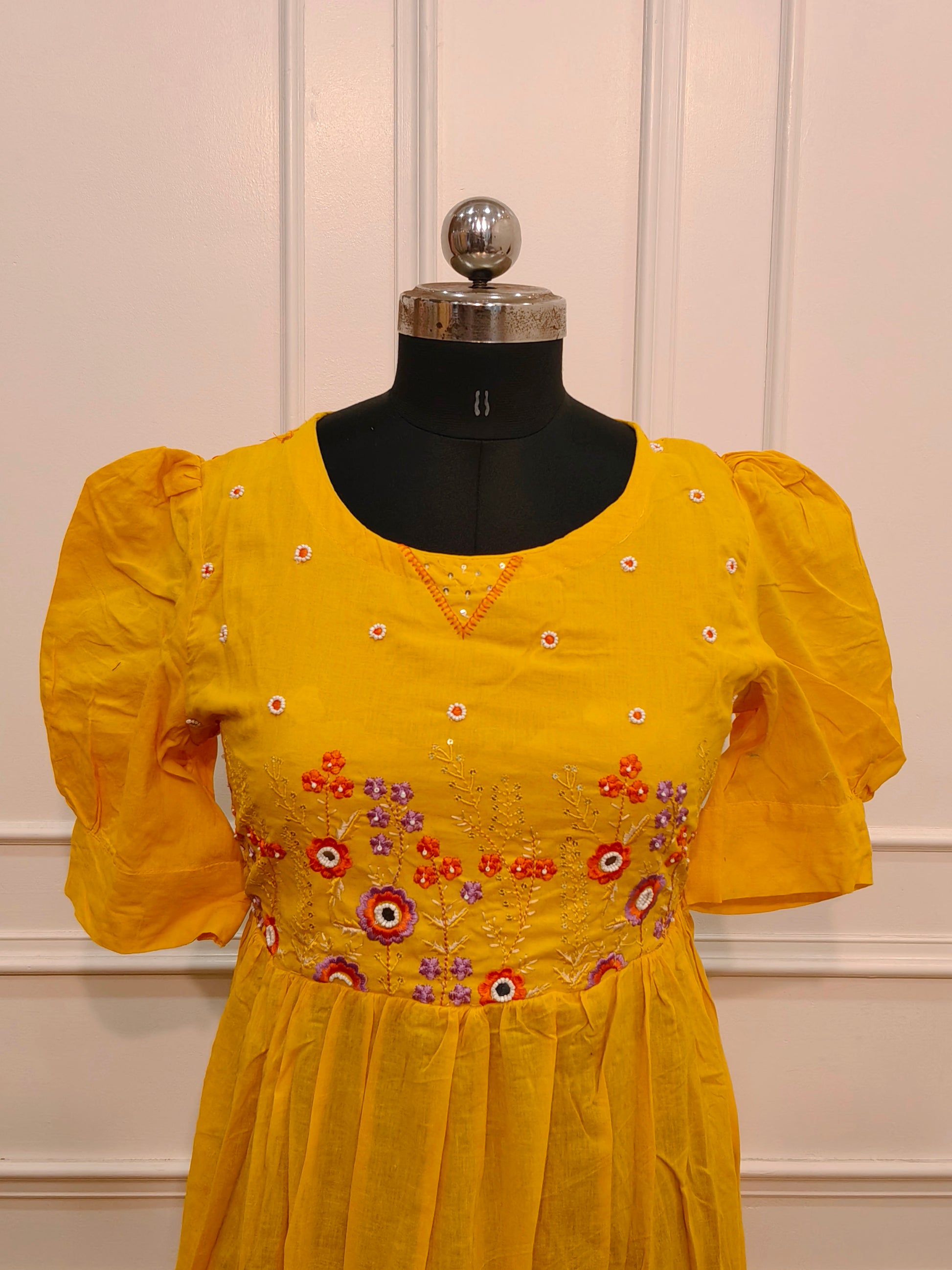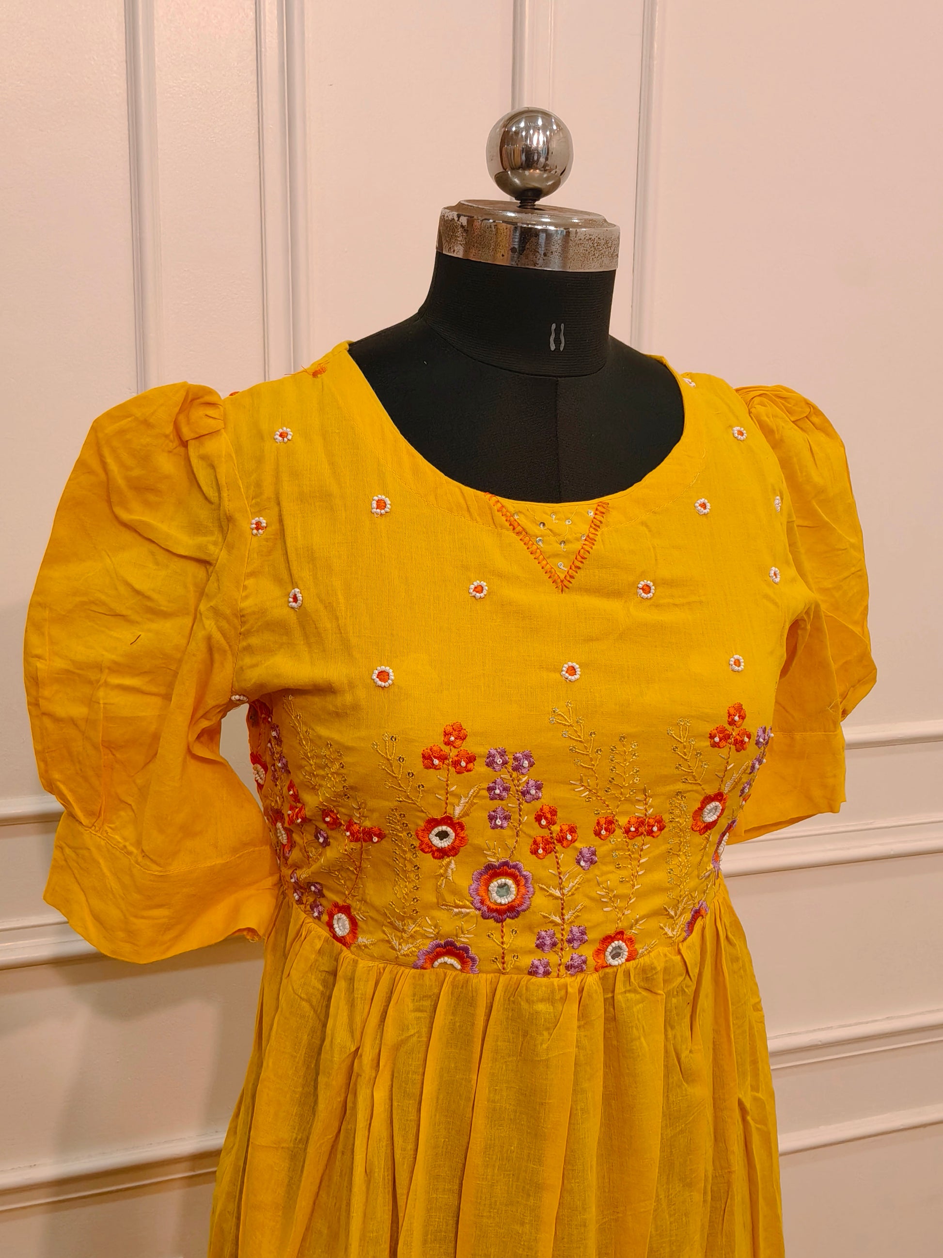 Elegant Mustard Yellow Cotton Maxi Dress with Embroidery work 115