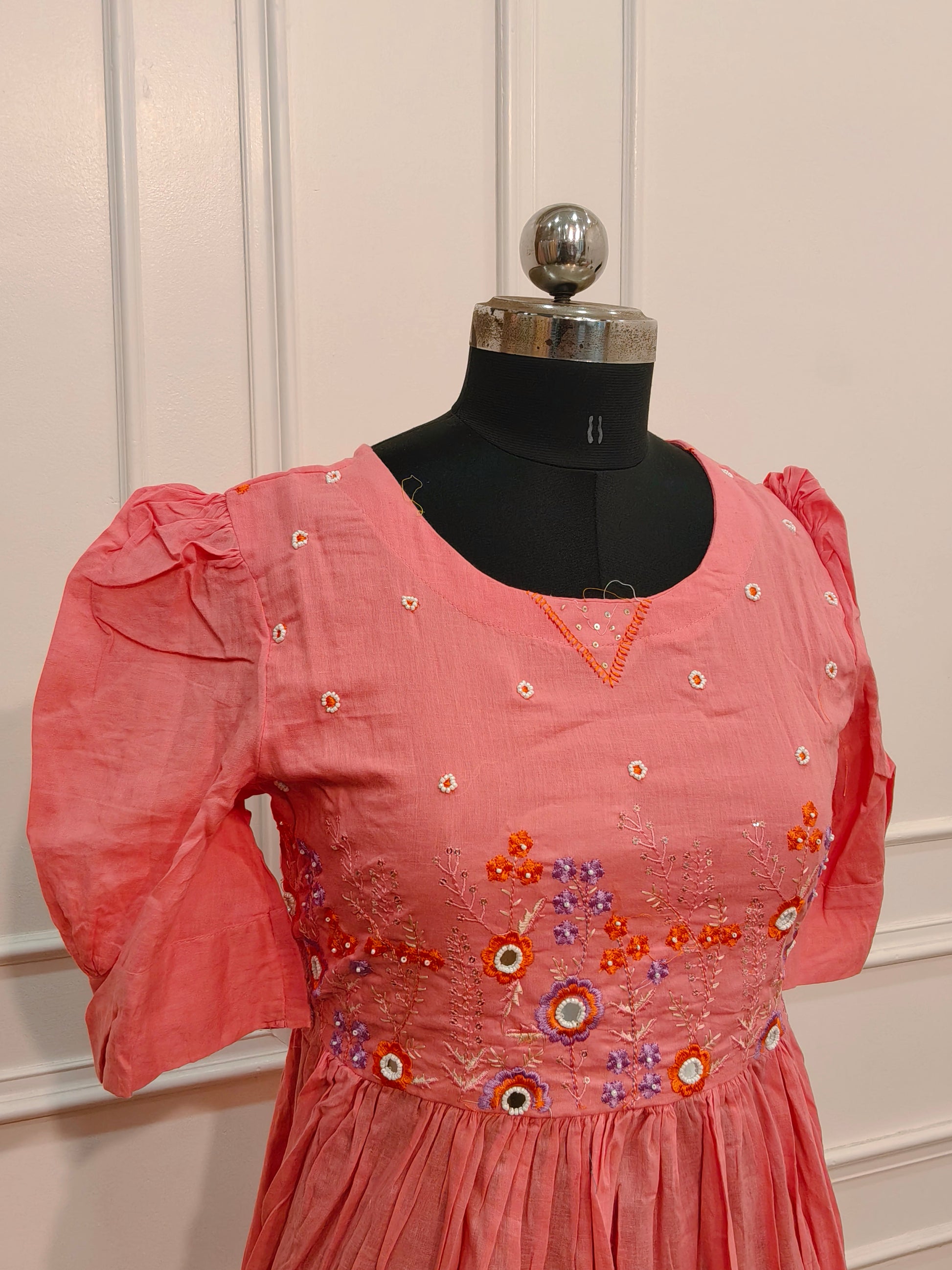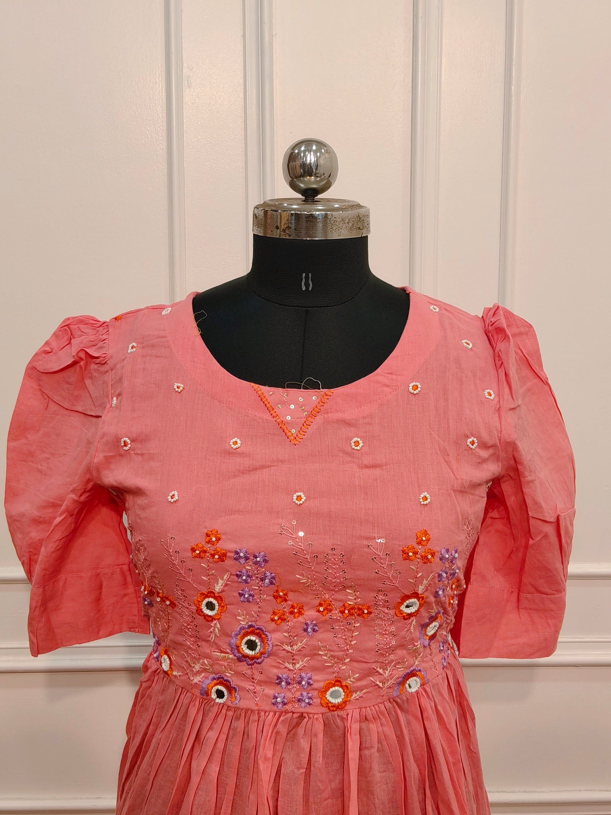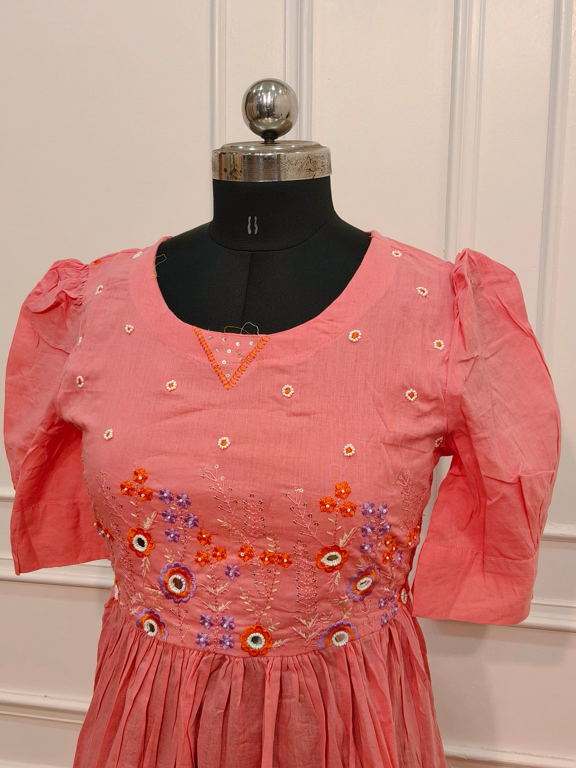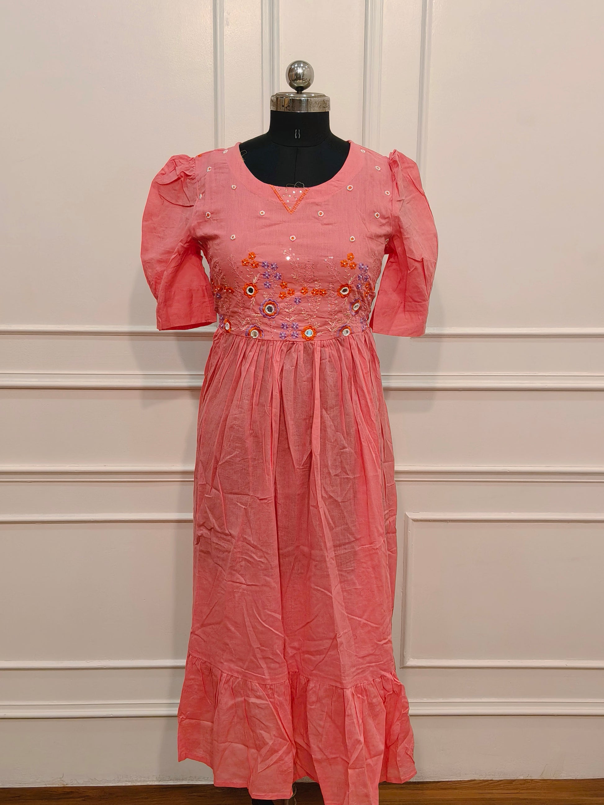 Elegant Peach Cotton Maxi Dress with Embroidery work 115