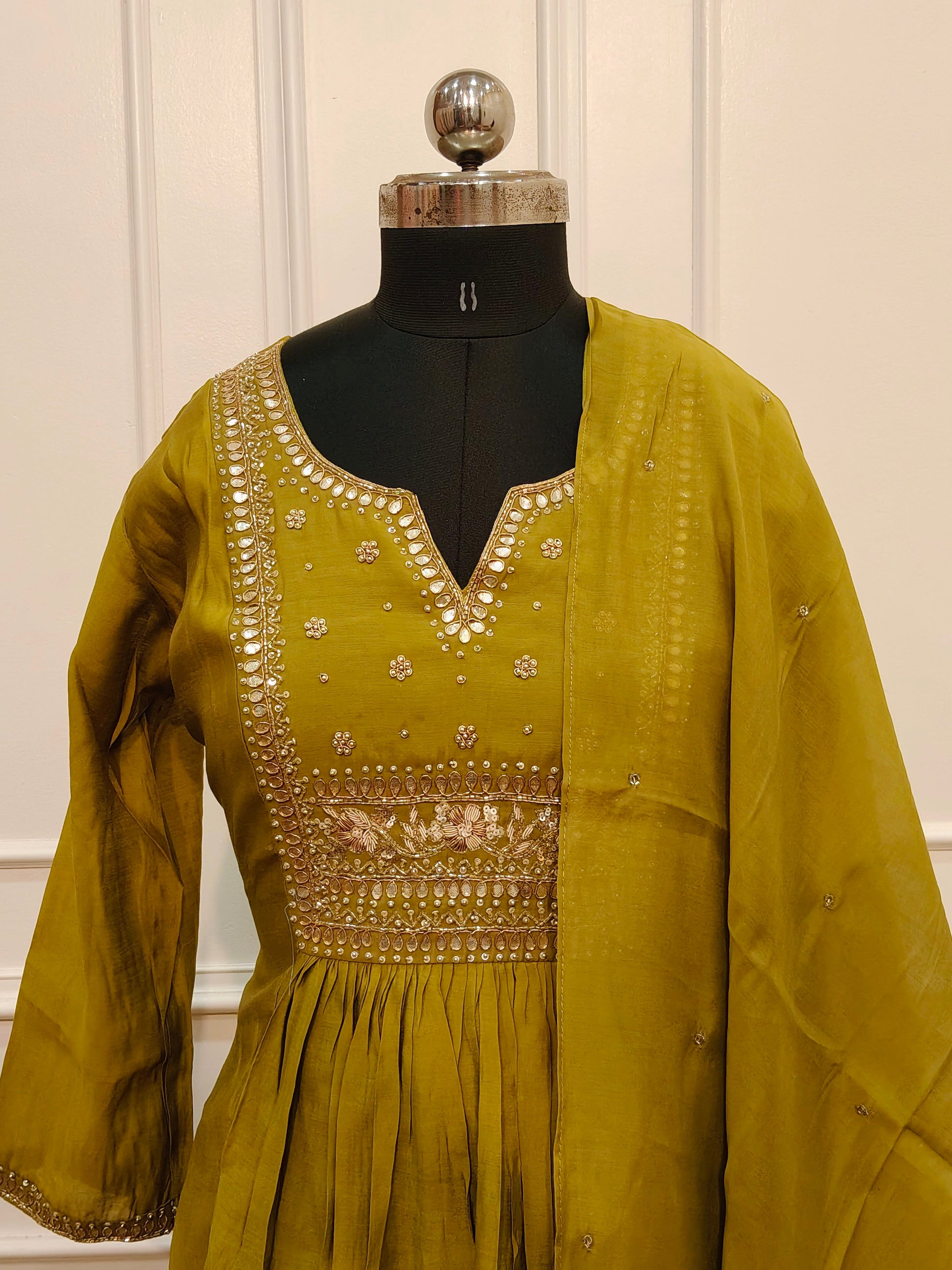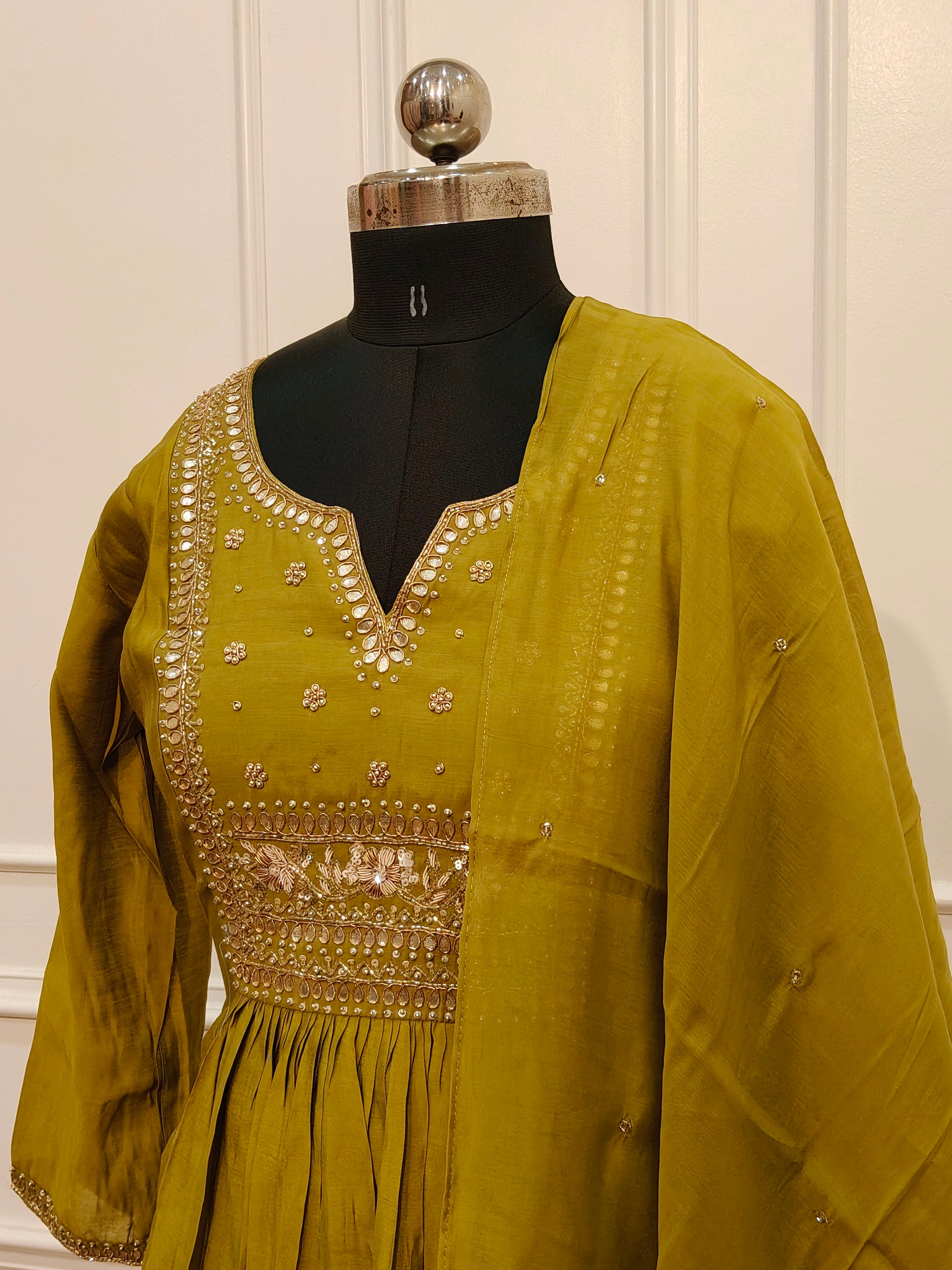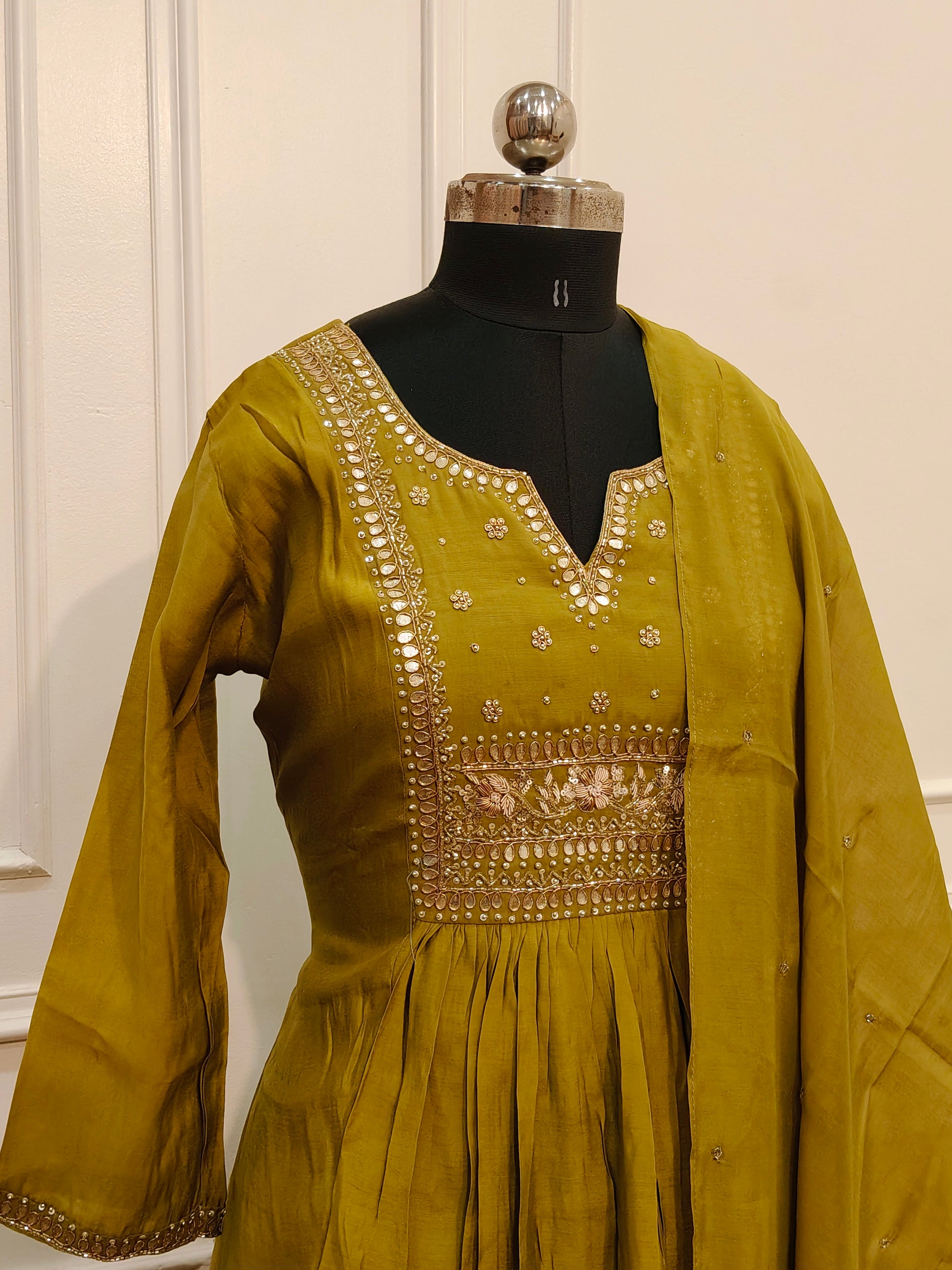 Mehandhi green Mull chenderi embroidery 3pc anarkali set 245