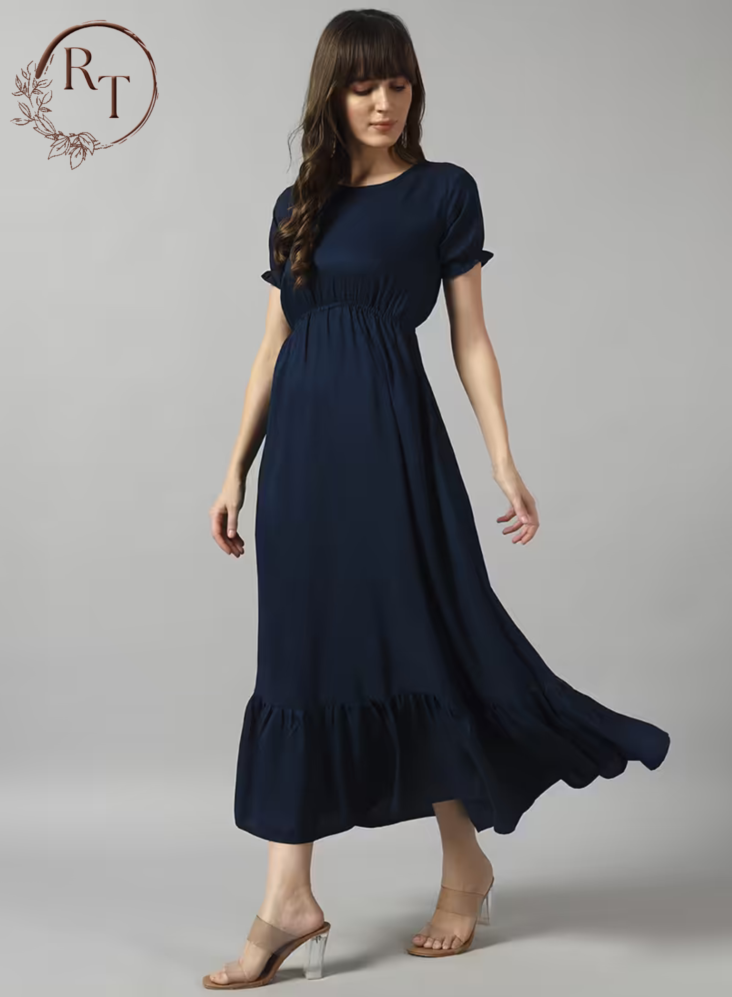 Step into effortless elegance with this Solid Flared Long Frock, crafted from soft, flowy fabric for all-day comfort. Designed with a round neckline, puffed sleeves, and a gathered waistline, it offers a flattering silhouette that complements every body type. The flared hem adds movement and charm, making it perfect for both casual outings and special occasions.