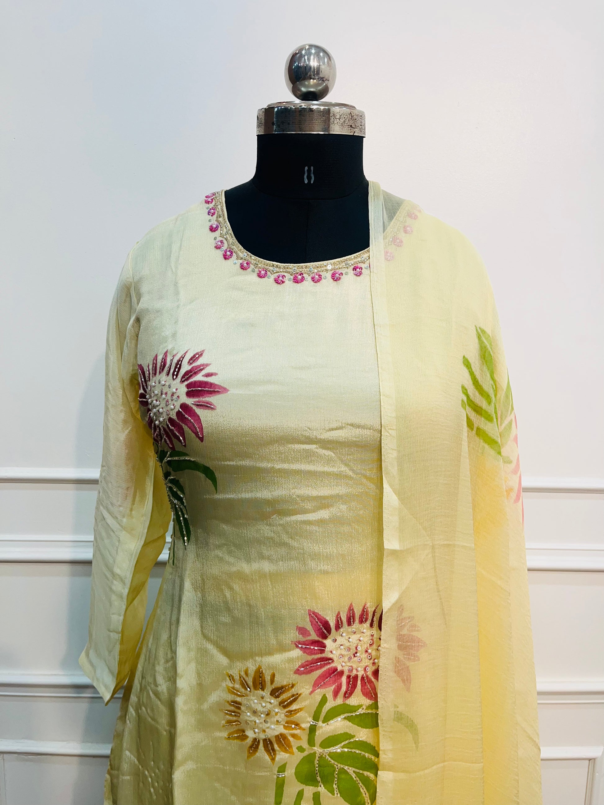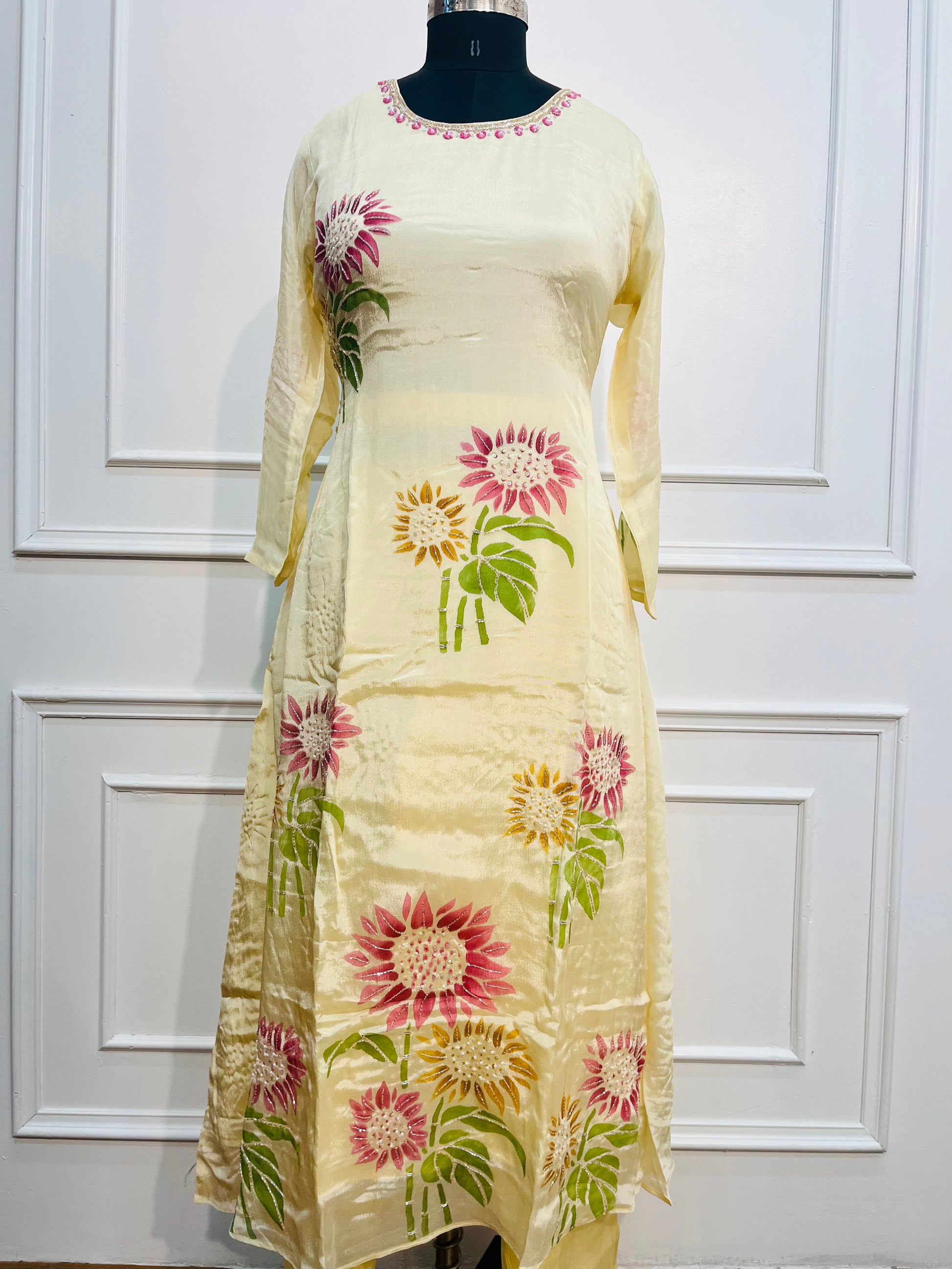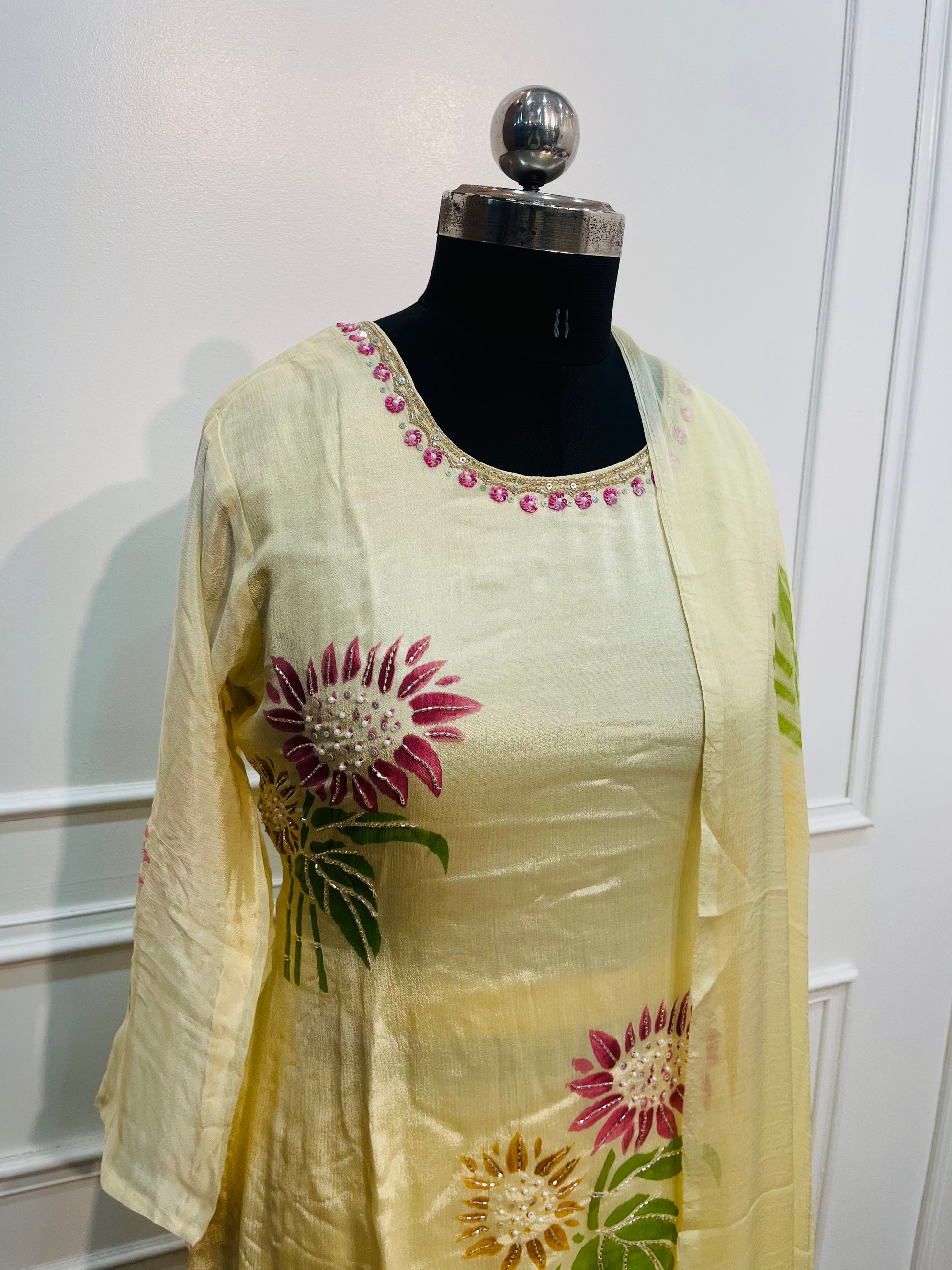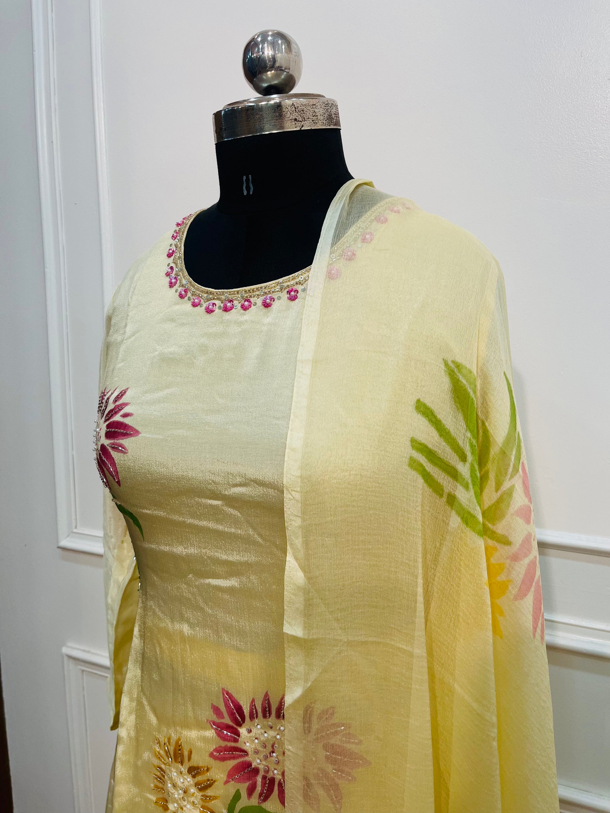 Yellow chinon BrushPaint design 3pc kurthi set 275