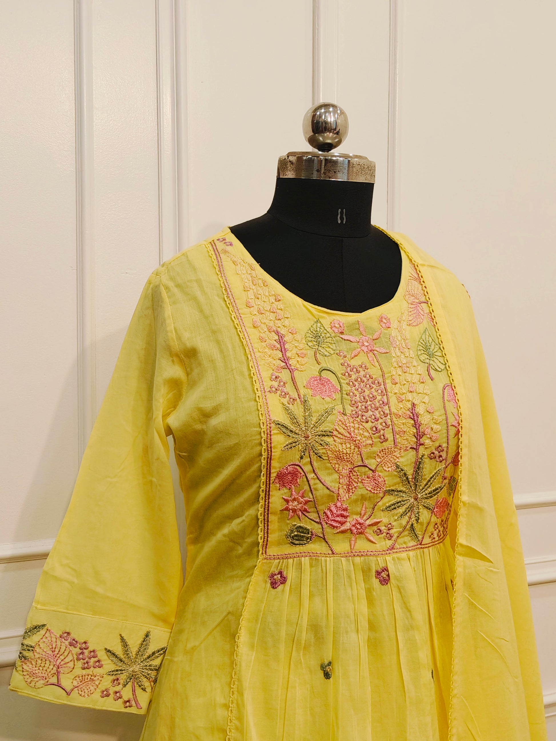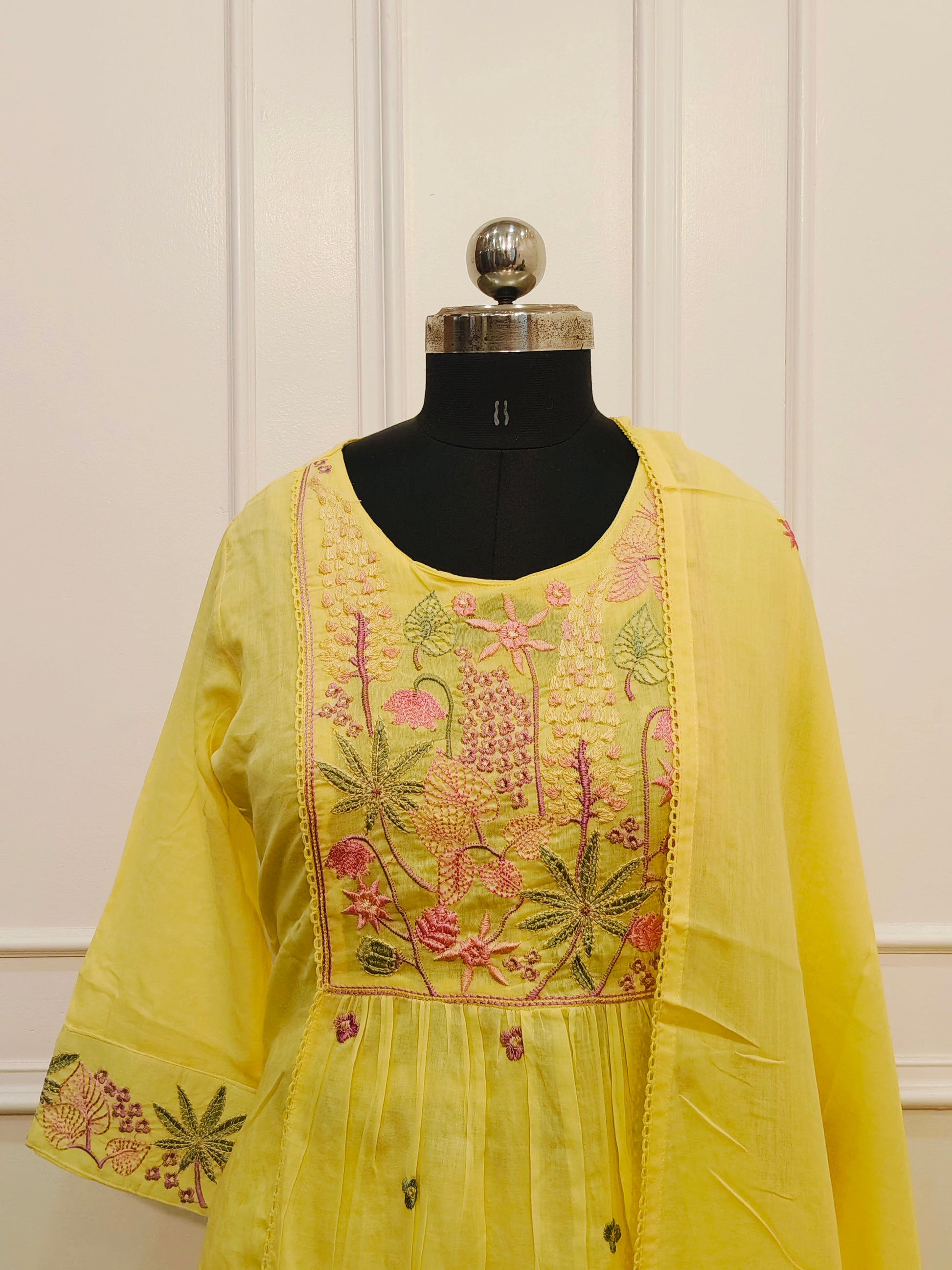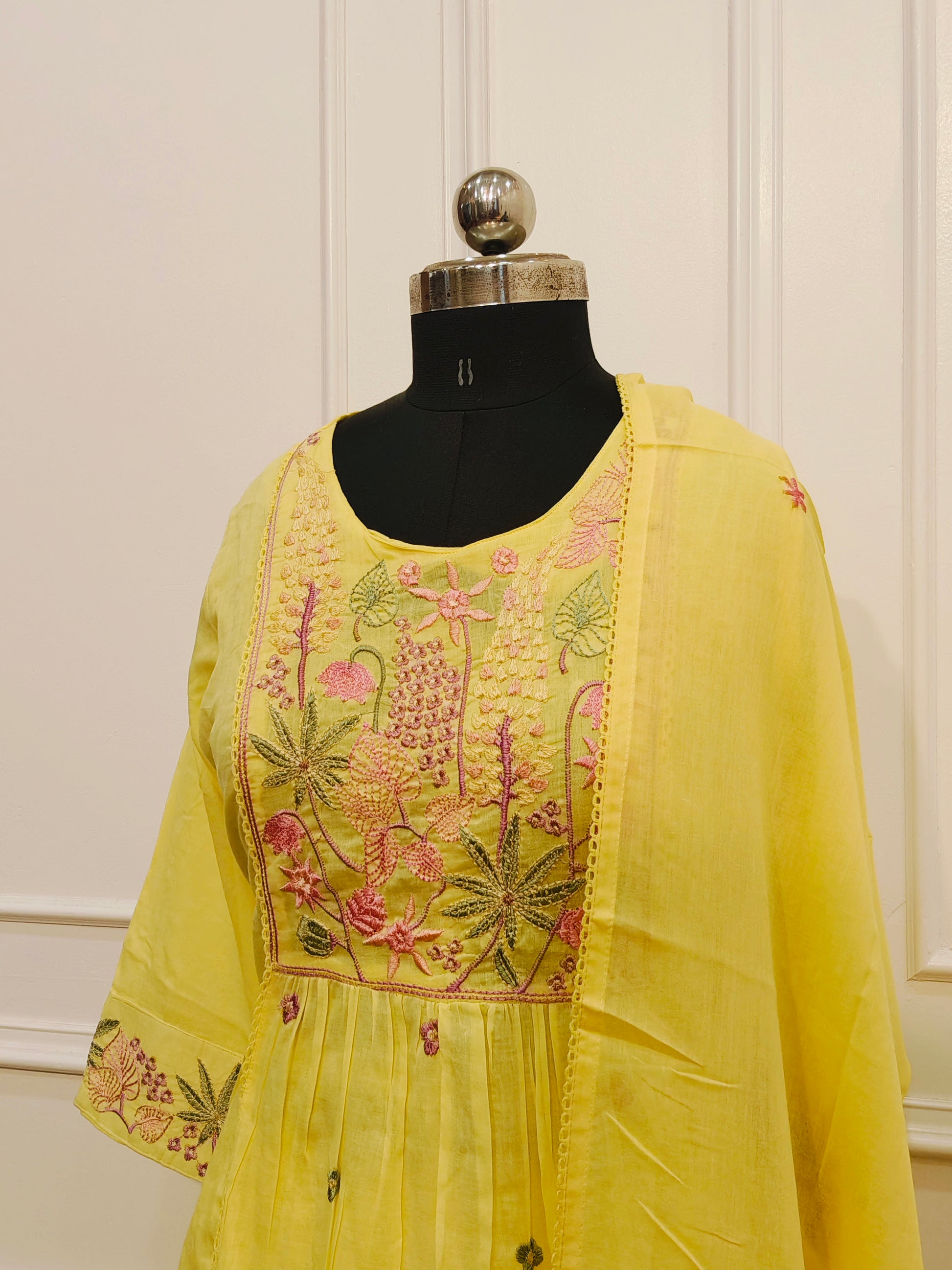 Yellow MullCotton Floral Embroidered Anarkali 3pc set 145